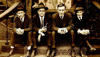 Turner Classic Movies will be showing Godard’s Contempt featuring Brigitte Bardot, Jack Palance and Fritz Lang (pictured above w/snazzy monacle) on Oct 5th @ 2 AM EST, set your Tivo (or as my cable company calls it DVR). They’ll also be showing a Todd Browning triple feature of Mark Of The Vampire/Freaks/Devil Doll on Halloween which is a bit of a disappointment as they’re the easiest Browning films to see. Last year they showed the silent versions of West Of Zanzibar (which William Cohn remade in 1932 as Kongo with Walter Huston in the Lon Chaney role as Phroso “Dead Legs”, perhaps the most chilling character in film history, TCM is showing Kongo Mon, Oct 20th @ 6 AM EST). and the Unholy Three (remade in 1930 as a talkie by Jack Conway, it was Lon Chaney’s only speaking role). Mr. Browning is pictured above second from the right (it’s from a snapshot the wife found). Browning started out as a carny and entered the world of film through his old Louisville pal D.W. Griffith serving as the assistant director on Intolerance. Browning directed sixty two films (found here).