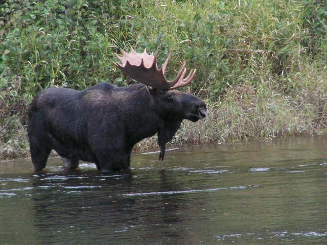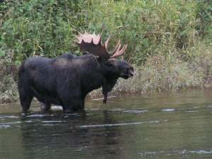 Where my wife comes from in New Brunswick, Canada they have quite the wild life, mammals all over the place, some of them are gigantic. Once she was talking on the phone of the breakfast nook at her parents’ house and a brown bear jumped out of the garbage can below the window. Moose hunting is big up there and the first moose bagged during moose hunting season of 2002 pushed 9/11 off the front pages of the local newspaper. Here’s the best rock’n’roll record ever made about a moose, from the Specialty label Roddy Jackson’s “Moose On The Loose“. Above is a New Brunswick moose, I don’t know his name. I imagine somebody shot and ate him by now as he’s a pretty big target.