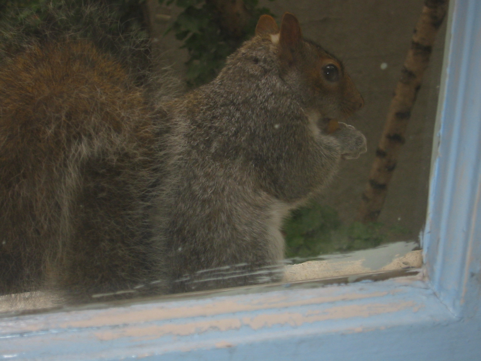 Back in my yard, nature took its course soon the squirrels had little duffer– I call him Bingo. Bingo soon grew larger than his father and commandeered the entire yard as his turf. Peaches manages to hold her own when they fight over the food (I try and throw her food on one side of the ten foot stone wall that separates us from the church, and Bingo’s on the other to keep them from killing each other) but Peaches is starting to show the scars from raising a brat, one of her ears is now in shreds. Large Boy is terrified of his spawn and shyly comes around begging for nuts only when Bingo is off doing what ever the hell he does. I forgot to mention, Bingo is retarded. I know this because I can throw a nut inches from him and it will take him a half hour to find it. Sometimes he sniffs around in circles for fifteen minutes, missing the nut that is inches from his snoot, then gives up and goes back to his post in the walnut tree. When he does find the nuts he hides them in places where Large Boy can easily steal them, which is good because otherwise the older squirrel would starve to death.