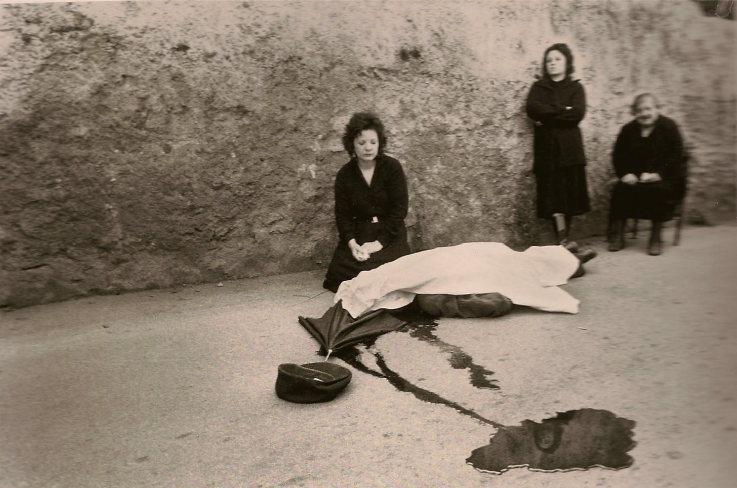 The above photos were taken by Palermo born photo journalist Letizia Battaglia and are from her book Passion Justice Freedom: Photographs Of Sicily (Aperture, 1999). Battaglia uses her camera to document not just the mob murders but the entire spectrum of influence that La Cosa Nostra has on day to day life in Sicily, and her riveting images of the other victims, such as the women and children left behind, living in slums, mourning over the bodies of the fallen, sharing a meal with rats, are among the most compelling you will ever see. The photo of the mother of a missing mafia punk, holding a photo of her missing, beloved son (middle) is one of the most haunting things I’ve ever seen. Battaglia raises photo journalism to high art. Unfortunately, after many years of documenting La Cosa Nostra crimes and a brief stab at Palermo city politics she’s been forced to flea Sicily and currently works in Paris. The photos here (pardon my crappy scanner) are reproduced strictly for review purposes and give just a hint at her great talent. Buy the book and you’ll see what I mean.