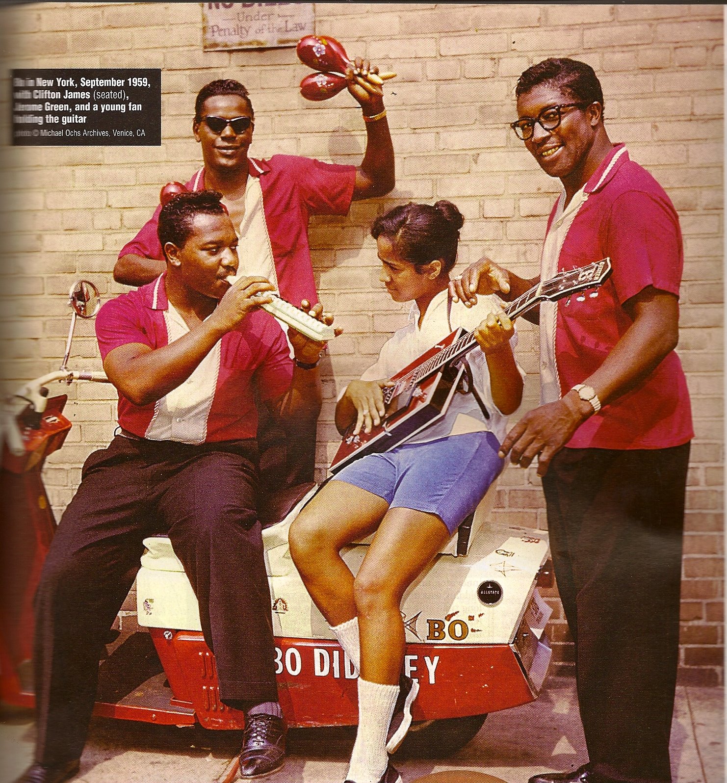 A tape exists of this garage jam and hopefully it will be released in our lifetime (Bo’s manager nixed the release of it when Bo was still alive, preferring to attempt to market some sort of hip hop Bo disc). Ellas Otha Bates McDaniel aka Bo Diddley: great guy, great glasses, great rock’n’roll star…maybe the greatest ever.