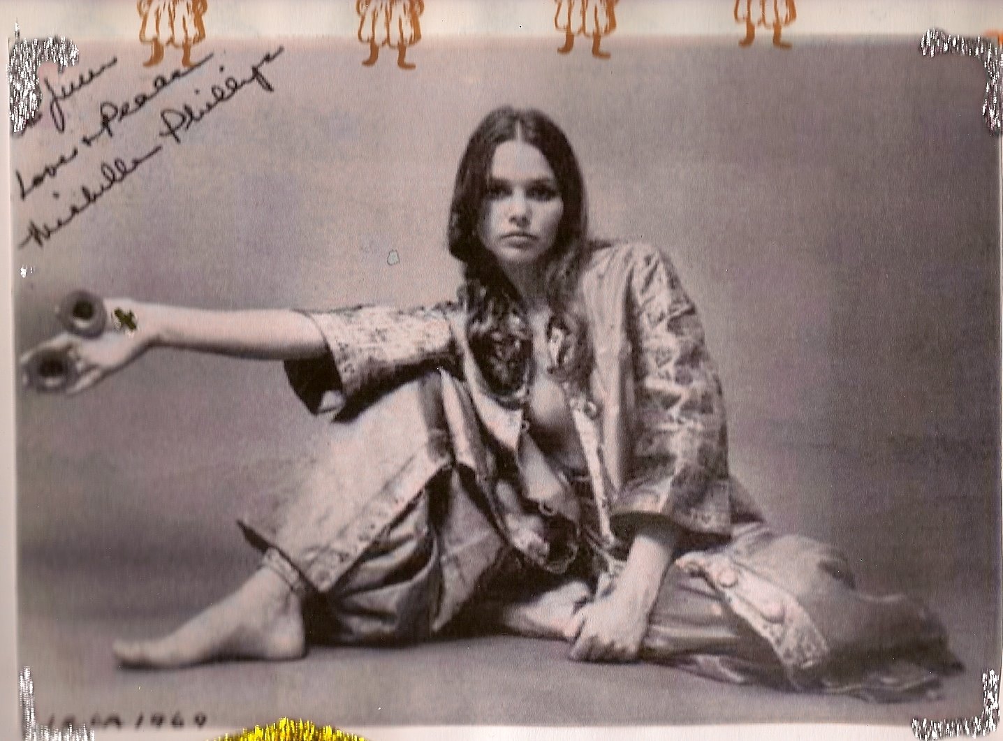 Michelle began as a sixteen year old runaway beatnik from L.A. who met John Phillips in the Bay Area, hooked up with him and ended up first in the last remnants of his folk group the Journeyman then with former Mugwumps Denny Doherty and Cass Elliot formed the Mamas and the Papas in L.A. in 1966 (after an acid fueled season of woodshedding in the Caribbean). The group only lasted eighteen months but their career was a wild ride, they were hippie royalty and rode the current for all it was worth. Their last performance was at the Monterey Pop Fest. where their caftans and mu-mu’s were already looking dated compared to Hendrix, the Who and Big Brother & the Holding Company. They knew when to quit.