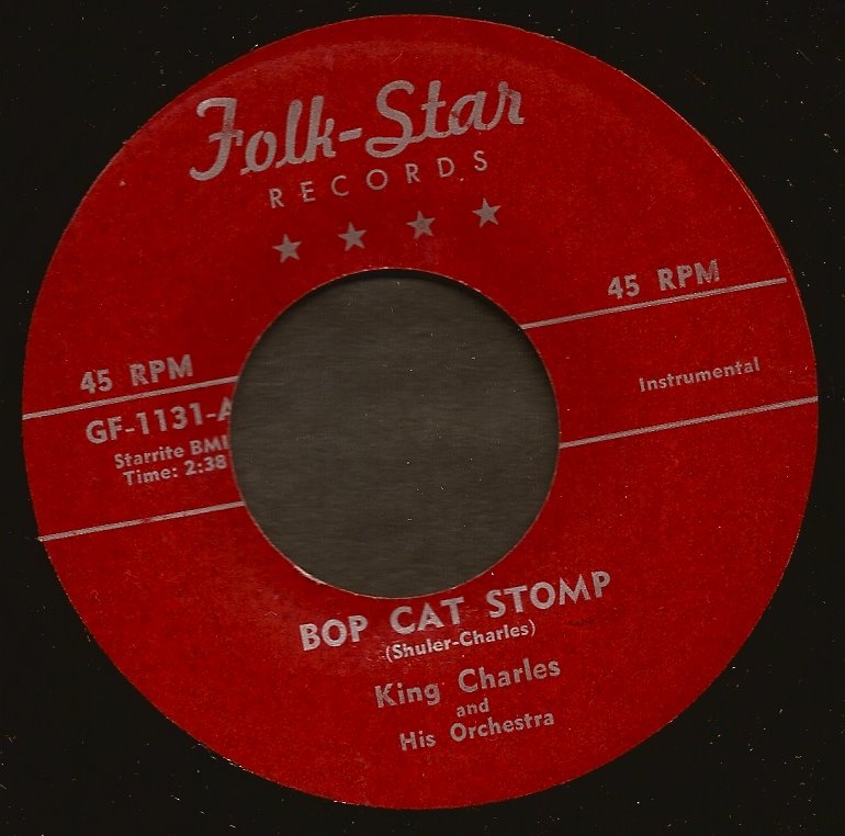 Plop goes the automatic changer and the next disc that hits the turntable is Bop Cat Stomp on the Folk-Star label, a subsidiary of Eddie Shuler’s Goldband Records from Lake Charles, Louisiana. The titled might make you think it’s a rockabilly platter, but it’s not, it’s a wild R&B instrumental rocker. The artist is King Charles and his Orchestra (the orchestra being guitarist Left Handed Charlie wailing away, a sax, piano, a bass player and drummer). If they still made records like this the world would be a much better place.