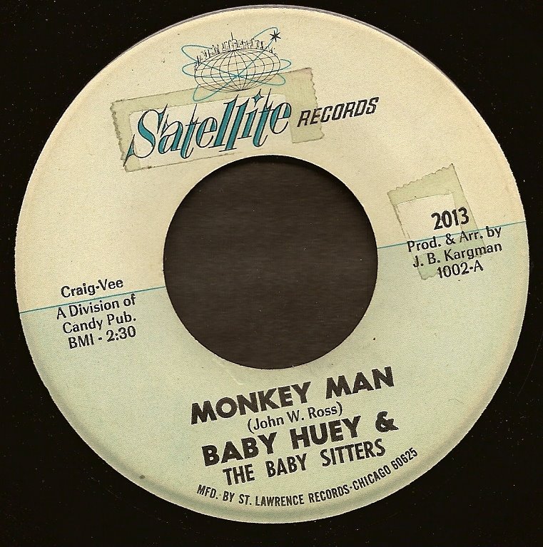 Now we set the Wayback machine for Chicago, 1966 and bingo, we land on Baby Huey & the Babysitters’ Monkey Man on the Satellite label (not the Satellite label from Memphis that became Stax). Baby Huey & the Babysitters where hugely popular on the frat circuit around Illinois, and the rotund Baby Huey has received much posthumous acclaim for the LP- The Baby Huey Story: Living Legend, produced by Curtis Mayfield, it’s something of a funk classic. I prefer this earlier and cruder sounding disc. Baby Huey (James Ramsey) was only 26 when his heart gave out in 1970.