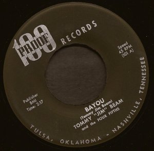 First one is Tommy Jim Beam & his 4/5th’s; if that isn’t the coolest band name ever, it’ll do ’til the coolest gets here. They were out of Fort Worth, Texas (despite the Tulsa and Nashville label info) and issued this disc on their own 100 Proof label. I’m gonna post both sides of this baby, the a-side (which I favor) is a spooky ballad called Bayou and it never fails to put chills up my spine. It’s probably the best white disc ever to feature bongo drums. The b-side is a feral rocker: My Little Jewel which gets extra points for mentioning Dragnet. I believe it was released in 1958.