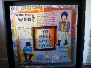 I really miss Dee Dee Ramone. Of all the Ramones, Dee Dee is the one I knew best. We hung out on and off for around 25 years. It was always a pleasure to run into Dee Dee, he always had a funny story, a strange antidote, bizarre things always happened to Dee Dee. In a way he sought them out, but in another way he was just a magnet for nuts and weirdos. Dee Dee was a doer, and not in a small way. Whatever Dee Dee did, he did a lot of, good or bad. When he decided he was going to be a writer he knocked off three books in less than five years, and all three are great: Poison Heart: Surviving The Ramones (with Veronica Kofman) (Firefly, 1997, this has also been published as Lobotomy), Chelsea Horror Hotel (Thunder’s Mouth Press, 2001), and Legend Of A Rock Star: The Last Testament Of Dee Dee Ramone (Thunder’s Mouth Press, 2002). When he got into painting he churned out hundreds of paintings (with help from wife Barbara and Paul Kostabi) we bought the one pictured above. He wrote thousands of songs. When he decided to move out of New York City, he moved dozens of times, first to Argentina, then Amsterdam, then a small town in the Netherlands, then back to New York, then upstate New York, then L.A., with Ann Arbor thrown in somewhere. He got a dog, an Airedale, it died. He got another dog, also an Airedale, it died, he got another. He couldn’t figure out why they kept dying. If Joey had OCD (Obsessive Compulsive Disorder), Dee Dee had CCD (Compulsive Compulsive Disorder, a condition I just made up).