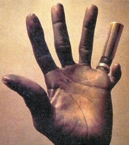Here’s some nice footage of Hound Dog Taylor, and that’s Little Walter, near the end of his life (he was only thirty two when he died) on harp. The second clip I just added thanks to who ever left the comment. The photo is H.D.’s six fingered left paw, no he didn’t use the extra pinkie to play slide, it was just there because God thought it looked cool. Although he died back in ’75, Hound Dog Taylor & his House Rockers were probably the last really great blues band. Blues has become one of the most offensive marketing tools in history and by this point just the word gives me a headache, it brings to mind bands like best exemplified by Blue Hammer, the jock blues band in Terry Zwigoff’s film (taken from Dan Clowes’ comic book) Ghost World (2001), white guys in thrift store suits and silly hats, and idiot guitar solo worship. Or as my old pal Ike Turner said–“Who want to hear white guys imitating what the blues used to be”? But Hound Dog Taylor & his House Rockers were kinda like the punk rock of the blues, primitive, noisy and proudly showing off the chops they didn’t have. They’re a good place to plant the tombstone for blues, and a great band whose music hasn’t dated at all– sloppy, drunk and derivative (those are compliments), their sound makes me miss drinking. Theodore Roosevelt Taylor, born in either 1915 or 1917 in Natchez, Mississippi had been kicking around for years, cutting the odd 45 for Chess, Bea & Baby, Alley and other small labels before Bruce Iglauer started Alligator Records in Chicago to record him and his House Rockers (Brewer Phillips- guitar and Ted Harvey- drums), releasing three albums: Hound Dog Taylor & his House Rockers (which can be found here) Natural Boogie, Beware Of Dog (here), and later two more LP’s of outtakes and live recordings-Genuine House Rockin’ Music (here) and Release The Hound (look here, downloaders), all great, all sounding pretty much the same. They would be the only good records Alligator ever released as Alligator soon pioneered the beer commercial sound that we think of today as blues. Death to digital reverb. As Hound Dog said of himself, “When I die they’re gonna say–he couldn’t play shit, but it sure sounded good”. Calling him derivative is besides the point, all blues (in fact all pop music) is derivative. Hound Dog Taylor based his sound on Elmore James’ “Dust My Broom” riff, of course Elmore James got it from Robert Johnson, who got it from Kokomo Arnold, who got it from somebody else, it hardly matters who. On his earlier sides he comes off as just another enjoyable but fairly generic Elmore imitator (c.f. his version of Watch Out with Big Walter Horton on harp, issued by Chess in ’67), but with the House Rockers’ rhythm section he found a way to put his own personal stamp on the old riff, which is really what it’s all about. Here’s some highlights: Kitchen Sink Boogie, My Baby’s Comin’ Home, Roll Your Moneymaker, The Sun Is Shining, Dust My Broom and Brewer Phillips’, who played the bass parts and lead guitar simultaneously, is showcased on this whacked out version of What’d I Say. They could even take a goofy tune like “She’ll Be Comin’ Around The Mountain” and make it rock and roll (I’d like to have heard ’em tackle “The Ink Dinky Spider”). It’s obvious from these recordings that these guys were pretty drunk for most of their sessions and gigs. Now let’s face it music was better when it worked on the alcohol standard (i.e., musicians were paid in booze and just enough money to buy a new set of strings). Perhaps a return to such practices would improve the dire state of modern music, if not the lifestyles of the rich and useless. I don’t know if any amount of booze could help Coldplay but they sure couldn’t get any worse. And I doubt if Hound Dog Taylor & his House Rockers would have sounded any better sober. The richer the artist the worse the music. Something to think about….