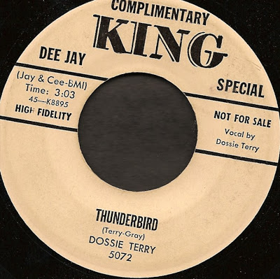 Back in April after the mammoth bloggeration on the subject of Thunderbird (the song and the wine, here), my pal Barry Stoltz e-mailed me to remind me that I’d forgotten this version, on King by Dossie Terry. I meant to go back and add the thing but of course, I forgot. Anyway, I finally pulled the 45 off the shelf and played it, it’s a great record by something of a mystery artist, so I thought I’d post it. In my opinion any record with a Mickey “Guitar” Baker’s guitar solo (see Jan. 9th posting for more on my Mickey Baker worship) is worth hearing, and second, this version is musically unique in that Dossie adds what’s called in music a “middle eight”, that is, a change up in the middle that lasts eight bars, giving this rendition a extra verse that makes it unique. This same version was re-issued by King in the 70’s with the Lamplighters’ Be-Bop Wino on the flipside, a marketing move that I assume was aimed at skid row juke box operators.