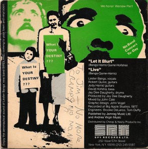 That Sunday night Lester’s band played at CBGB on a bill with Alex Chilton (The Ramones/Cramps double bill was Friday and Saturday). Lester’s band that night were the guys who played on his first single– Let It Blurt b/w Live (Spy), Bob Quine and Jody Harris on guitars, David Hofstra on bass and J.D. Daughtery on drums. I only remember that they covered the Doors’ Five To One, The Stooges’ TV Eye, and that when Lester introduced an original called I Sold My Body and Bradly Field yelled “By the pound”! There were at least fifteen people in the audience.