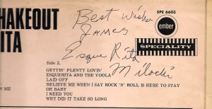 Rare discs in hands, we headed for Tramps, and there he was: the legend, the man– Esquerita himself! His hair was short, and he looked like he’d ridden some hard miles, but it was he, the guy who made those insane records way back when. There must have been a dozen people in the audience that first night, but he was amazed and thrilled that anyone, never mind bunch of white kids who were either in diapers or hadn’t been born yet, knew of his great achievements at Capitol Records. He signed our discs, had his photo taken with us, and he was our pal— our very own pet legend.