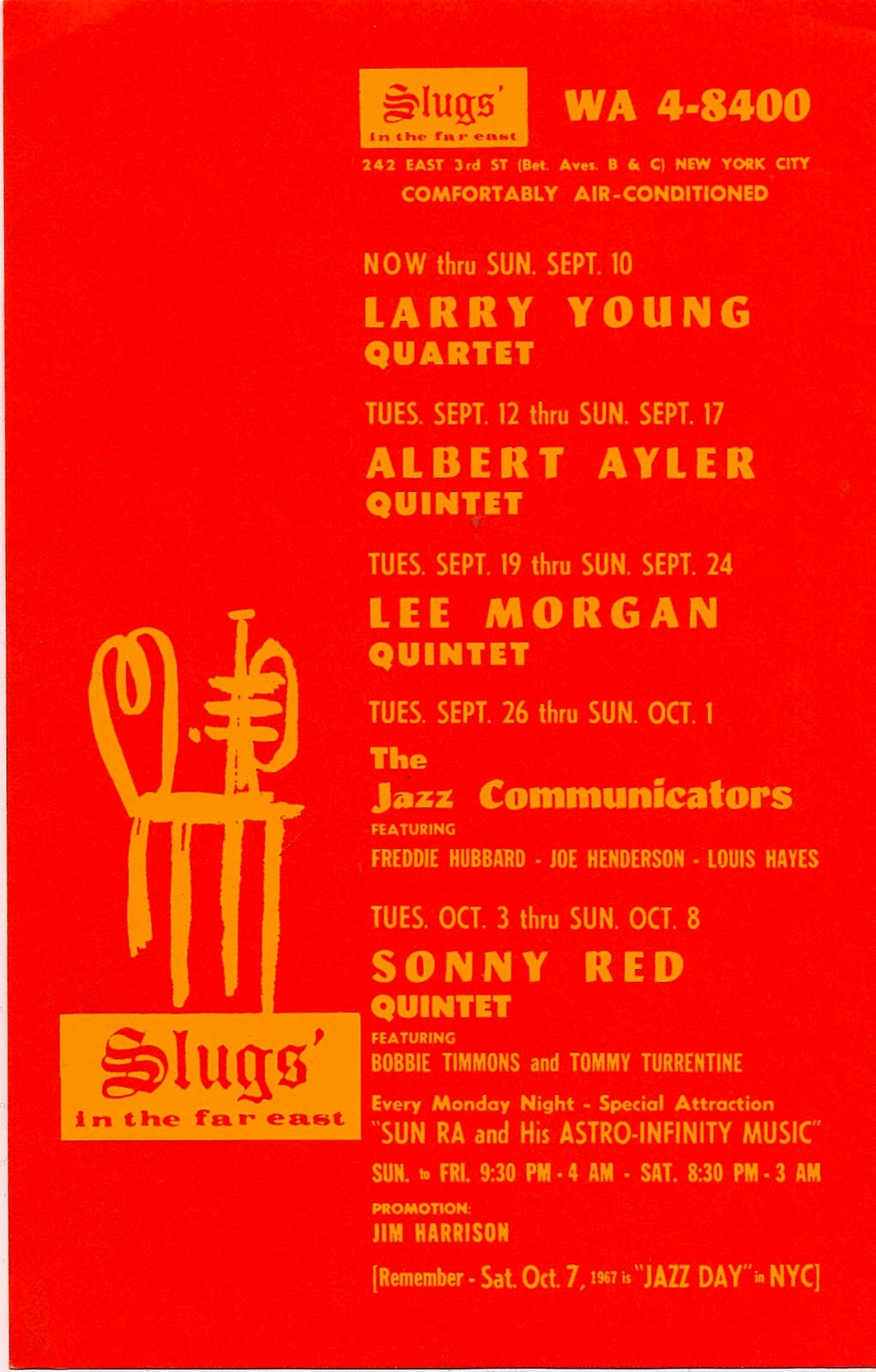 Handbill for Slugs on Ave C. Lee Morgan would be murdered out front in ’72 by a jealous girlfriend. Notice Sun Ra playing every Monday. Thems was the days.