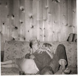 Is it my imagination, or has this guy wet himself? Somebody went to work on the front of his hair with the peroxide, notice the back and his eyebrows don’t match the front. And he hasn’t washed his feet in a couple of weeks. No doubt this gal’s been keepin’ him busy. The tight, satin capris and sweater combo will get ’em every time. It looks like the Fang has stumbled into Larry Clark territory ten years before Clark himself got there. Teenage Lust indeed. I’d guess this photo was taken somewhere between 1956- 1963. What do you think their story is?