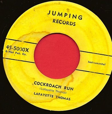 Today he’s mostly forgotten except for me, Jimmy McCracklin and the guy with illustrated discography web page. So what? Who cares? That was fifty years ago! Why do I keep digging out these obscure names and writing this swill? I asked myself these questions while I’m logging the tunes onto this page for anyone who wants to hear (or download) ’em. I mean, I already have the records, I can hear ’em whenever I want. I guess I’m still amazed at how many incredible, unique characters were out there that could channel their personal idiosyncrasies through rock’n’roll. It sometimes astounds me how many great records there are to hear. Like a bottomless well of great, wild records that only a handful of people have heard. Sadly, the well seems to have dried up sometime around the mid-sixties. In a way, there’s probably more good guitar players around today as ever, but good as in technically proficient, the wrong kind of good, because unfortunately they all sound the same to these ears. I guess back before the corporate takeover of the music biz, the guys who ran these little labels were always looking for something new, something unique. Unique was Sam Phillips’, the first to record Lafayette Thomas solo, mantra. Nowadays the knuckleheads in charge want everything to sound the same. Same drum beat— just pick a setting on the machine (there’s probably one built into your computer, there’s one on mine), even the Rolling Stones do it, sample the drums that is, but it’s the same with guitar players, a stage full of effects pedals don’t help, it still sounds like the same shit. But these old guys, they all sounded different. Lafayette Thomas didn’t sound anything like Ike Turner who didn’t sound anything like Johnny Guitar Watson who didn’t sound anything like Link Wray who didn’t sound like Lowman Pauling….you get the picture. You hear one of these guys, none of ’em were technically great players, some of ’em can hardly play, and some of the best played out of tune (i.e. Chuck Berry) but you can recognize their sound in a second, it was them, their whole personality, all the bullshit in their lives, channeled through six strings and fed into a broken down amplifier. I guess that’s the so called point of all this. And that’s what I like about driving myself crazy trying to find every record Lafayette Thomas played a guitar solo on.